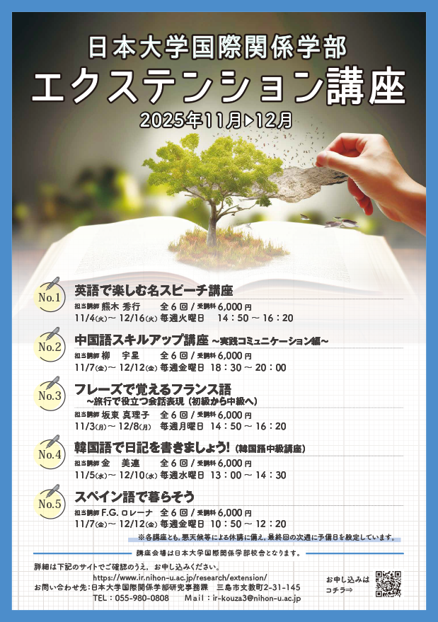 日本大学国際関係学部では、エクステンション講座を下記のとおり開講いたします。